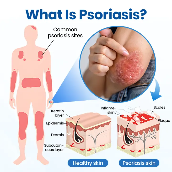 Psoriasis is a persistent autoimmune condition where the immune system incorrectly targets healthy skin tissue, causing accelerated cell production and accumulation. This results in inflammation, scale formation, and characteristic psoriasis patches, which may develop on any body part but frequently appear on the scalp, elbows, knees, and lumbar region.