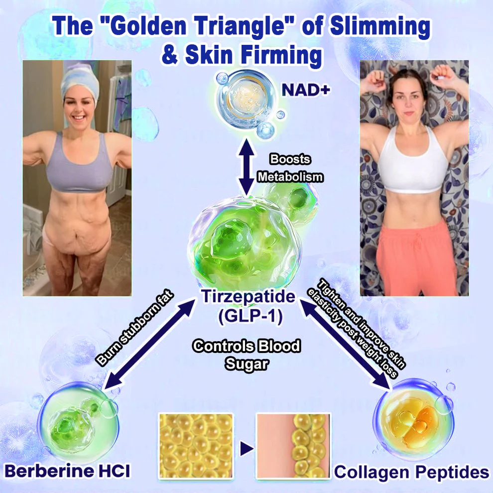 The product combines EGCG + Tirzepatide (GLP-1) with a variety of natural extracts to help balance blood sugar, suppress appetite, and burn fat, promoting gradual, healthy, and safe weight loss.