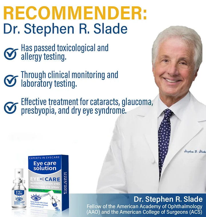 After four years of research, Dr. Stephen R. Slade and the American Academy of Ophthalmology have developed a revolutionary spray-type eye treatment for age-related vision problems.Unlike traditional drops, ROSOPL™ Blueberry Lutein Eye Spray delivers active ingredients through an ultra-fine mist, allowing them to be evenly absorbed by the ocular surface — no irritation, no dripping, and no wasted formula.Clinical data from over 80,000 participants showed that 96% of users experienced clearer vision, with symptoms of presbyopia, cataracts, and dryness greatly improved or eliminated.